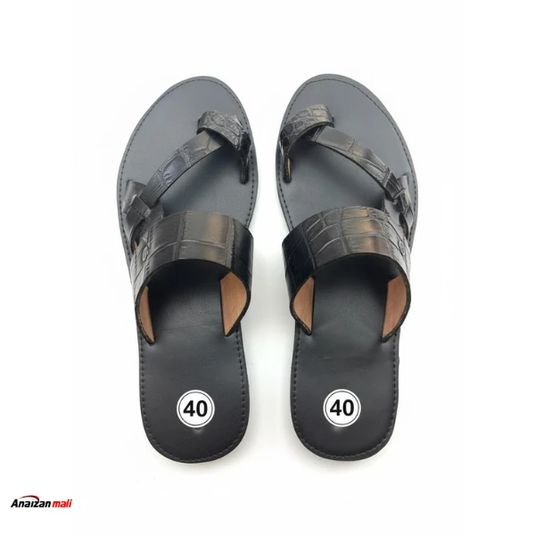 Alliez maintien et style avec ces sandales noires pour hommes de la collection Anaizan Mali. Ce modèle se distingue par sa structure robuste pensée pour le confort : un anneau d'orteil (entredoigt) relié à une bride latérale, complété par une large bande sur le coup-de-pied pour une stabilité parfaite. La finition "effet crocodile" noir brillant apporte une touche d'élégance et de modernité à ce nu-pied classique. La semelle noire, soulignée par des surpiqûres soignées, assure une durabilité idéale pour un usage quotidien. Caractéristiques principales : - Design : Structure double bride avec entredoigt pour un maintien optimal du pied. - Matière : Aspect cuir texture crocodile noir, élégant et résistant. - Confort : Large bride sur l'empeigne qui enveloppe bien le pied sans serrer. - Finition : Semelle noire plate avec coutures apparentes sur le pourtour. - Taille : Modèle présenté en taille 40 (disponible dans d'autres pointures). - Style : Polyvalent, parfait pour une tenue décontractée ou pour accompagner un ensemble traditionnel. Une paire essentielle qui combine l'esthétique du luxe et la praticité d'une sandale de marche. |